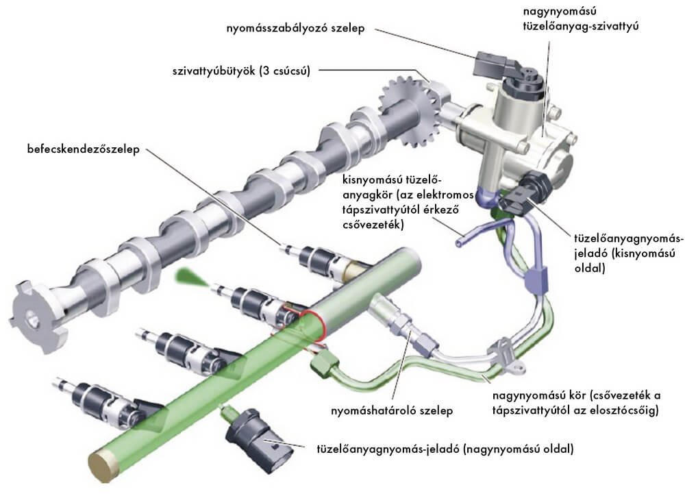 A nagynyomású szivattyú kb. 85 ºC hűtőfolyadék-hőmérsékletnél alapjáraton 35…45 bar nyomást állít elő, és 120 bar nyomást teljes motorterhelésnél. A tüzelőanyag-elosztó csőhöz csatlakozik a nagynyomású csővezeték, a nagynyomás jeladója és nyomáshatároló biztonsági szeleppel a visszafolyó ág. A visszafolyó ág „T” elágazóval csatlakozik a szivattyú kisnyomású tápvezetékébe.